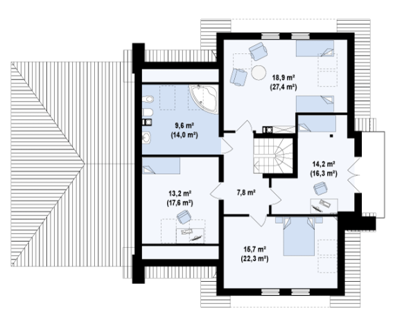 На втором этаже спроектированы сразу четыре спальни, что позволит с комфортом разместить большое количество Ваших гостей. Одна из спален имеет выход на балкон. Здесь же есть общая ванная комната.