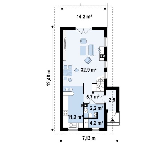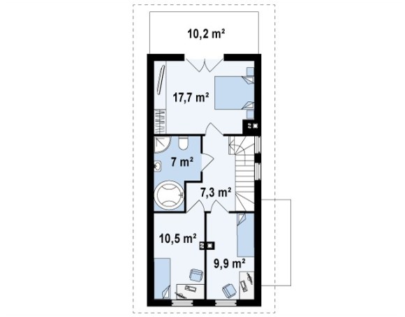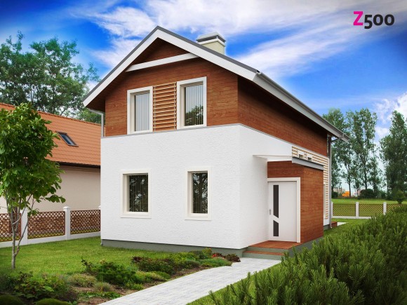 Проект дома для узкого участка Z25 специально спроектирован для участков сложной формы. Часто получается так, приобретаемый участок очень узкий или имеет нестандартную геометрию – именно для таких случаев и разработан данный проект дома. При необходимости можно также отказаться от крыльца, что еще больше сократит ширину дома, и его можно будет построить даже на участке 12м2. При этом дом выглядит современным и эстетичным.