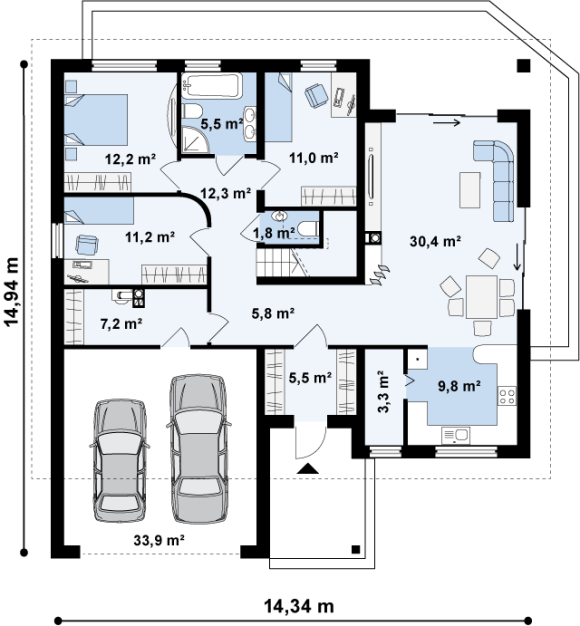 Проект одноэтажного дома с гаражом на две машины Z202