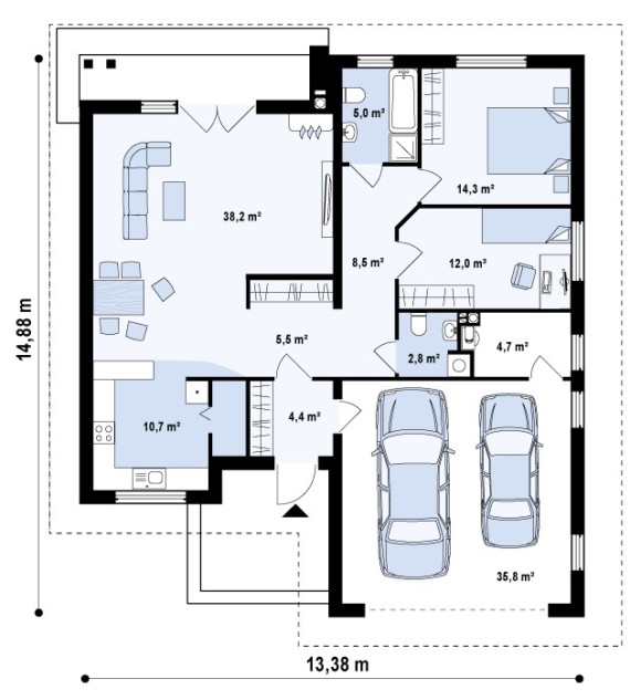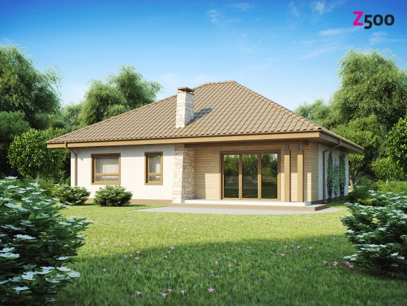 Проект одноэтажного дома с гаражом на две машины Z94 представляет собой относительно небольшой дом, планировку которого можно дополнять за счет чердачного помещения по мере необходимости.