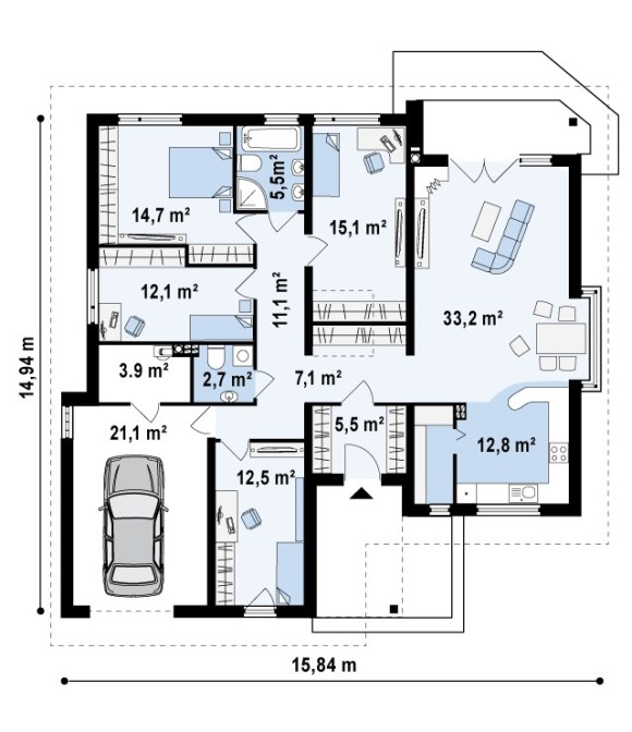 Гараж проекта одноэтажного дома Z205 очень удобен, так как вход в него предусмотрен прямо из дома через отдельный коридор. Кроме этого в гараже есть хозяйственное помещение-котельная, которое можно использовать и как мастерскую и как небольшой домашний склад.