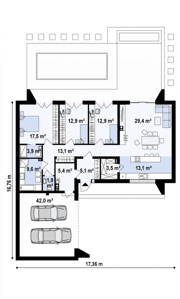 Проект одноэтажного дома с гаражом Zx135