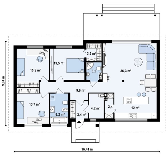 Проект одноэтажного коттеджа с большой гостиной Z140 v1