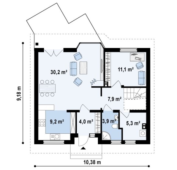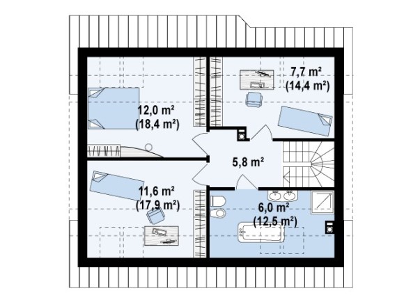 Несомненным достоинством проект частного дома с мансардой Z40 является его дешевизна при строительстве и обслуживании. При этом дом достаточно функционален для постоянного проживания.