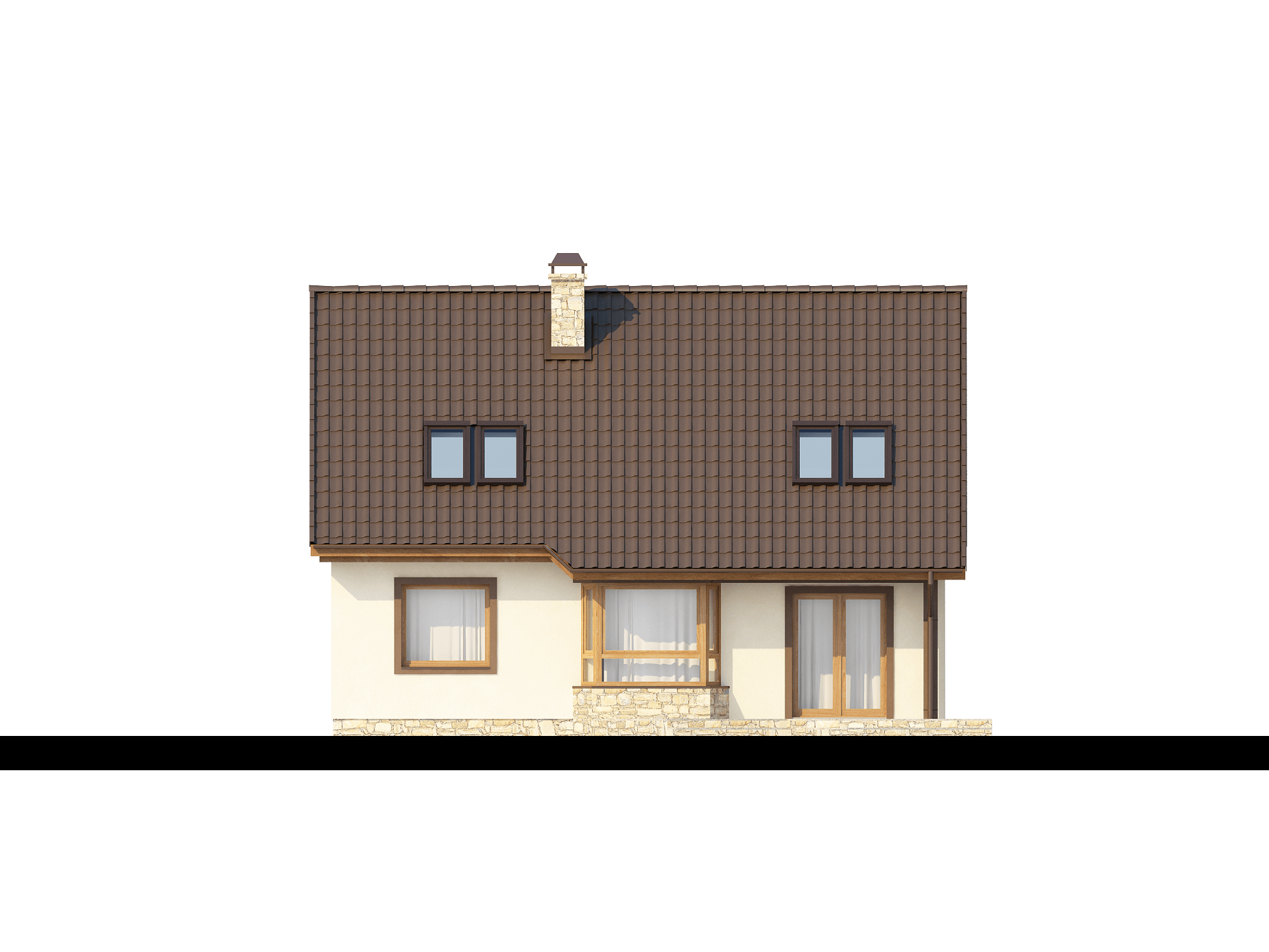 Вход, ведущий в коридор с гардеробом, расположен в центральной части дома. Далее идет большая гостиная с камином, где можно согреться всей семьей холодными вечерами. Рядом расположена обеденная зона. Гостиная и столовая всегда хорошо освещены через большой остекленный выход на террасу и эркер. В правой части дома расположен кабинет-спальня с большим платяным шкафом и ванная комната, рядом – лестница.